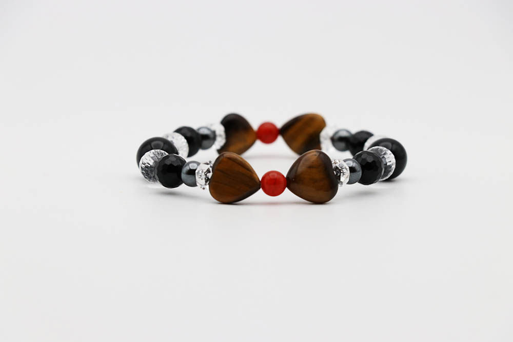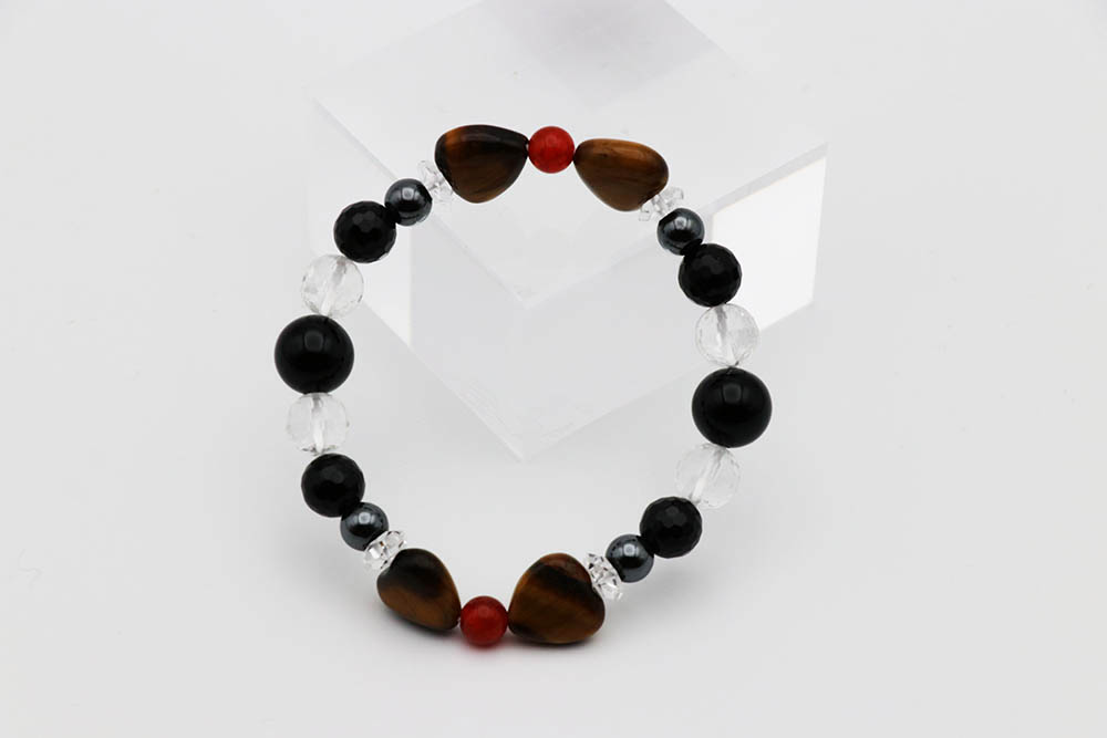 素材: タイガーアイハート12㎜ 赤龍紋めのう6㎜ オニキス10㎜ オニキス128面カット8㎜ ヘマタイト6㎜ 水晶128面カット8㎜ 水晶ボタンカット6㎜×3㎜