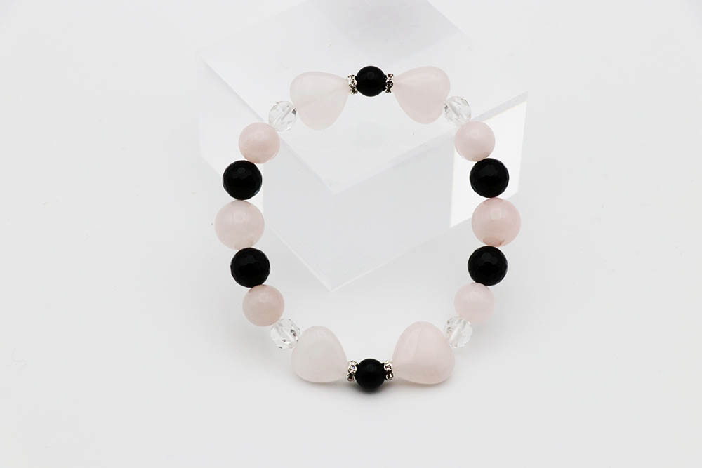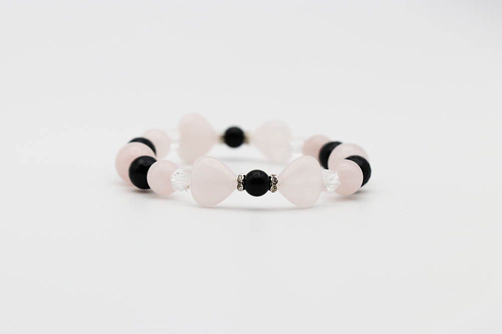 素材: ローズクォーツハート12㎜ ローズクォーツ10㎜ ローズクォーツ8㎜ オニキス128面カット8㎜ オニキス6㎜ 水晶スターカット6㎜ ロンデル4㎜